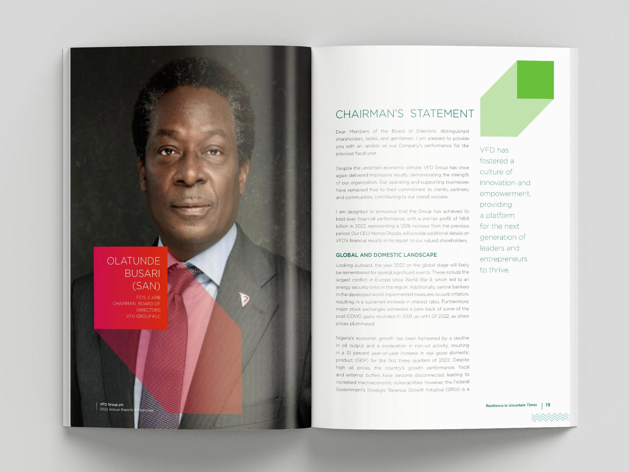 VFD Group is an industry-agnostic proprietary investment company focusing on building Africa’s most diverse business ecosystem by investing in and creating socially conscious businesses across industries. Our portfolio cuts across financial services, hospitality, real estate, oil and gas, power, and media industries